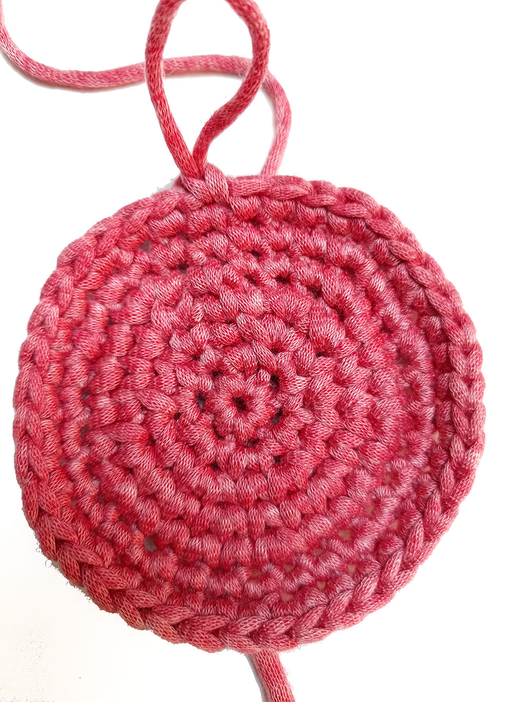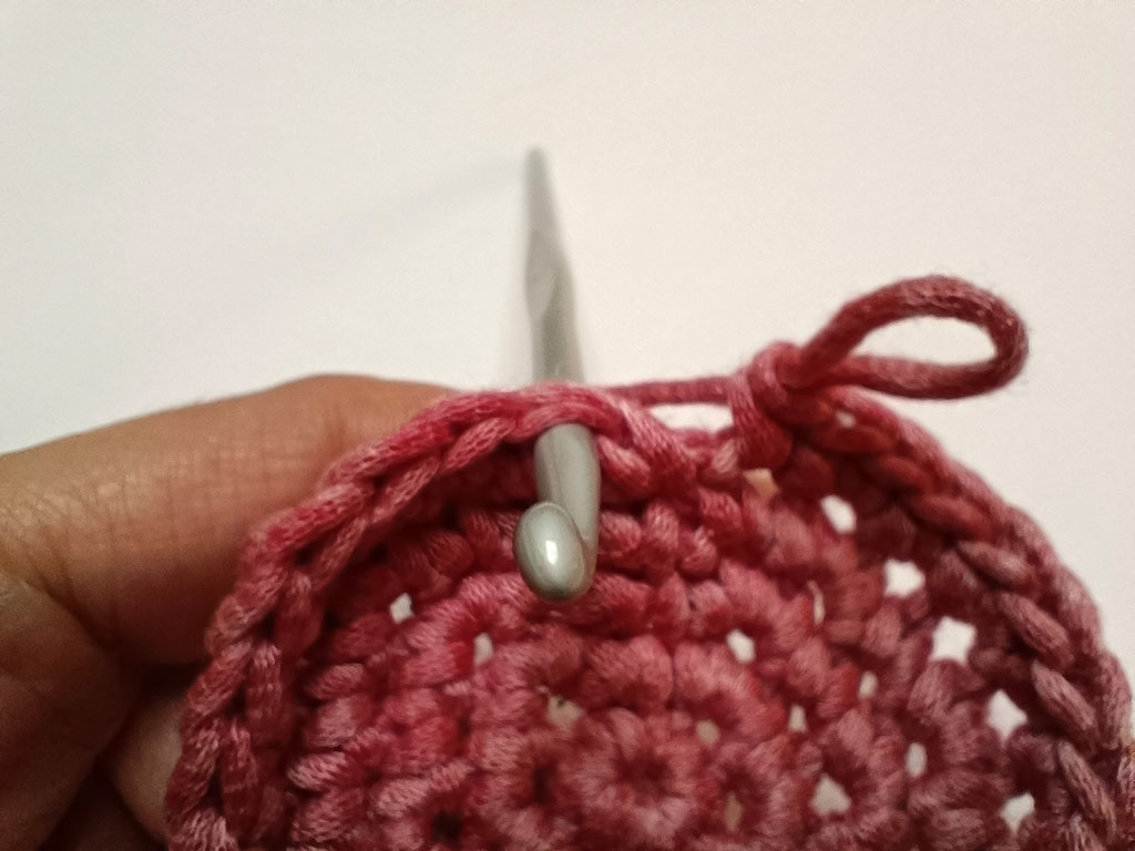 - togliere l’uncinetto dall’ultima maglia lavorata e inserirlo dal retro della prima maglia del giro