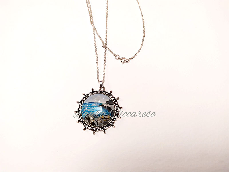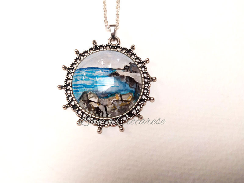 Collana color silver con ciondolo dipinto a mano con colori acrilici e protetto con cabochon in vetro.
