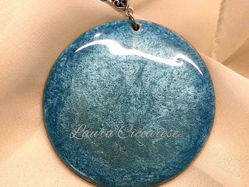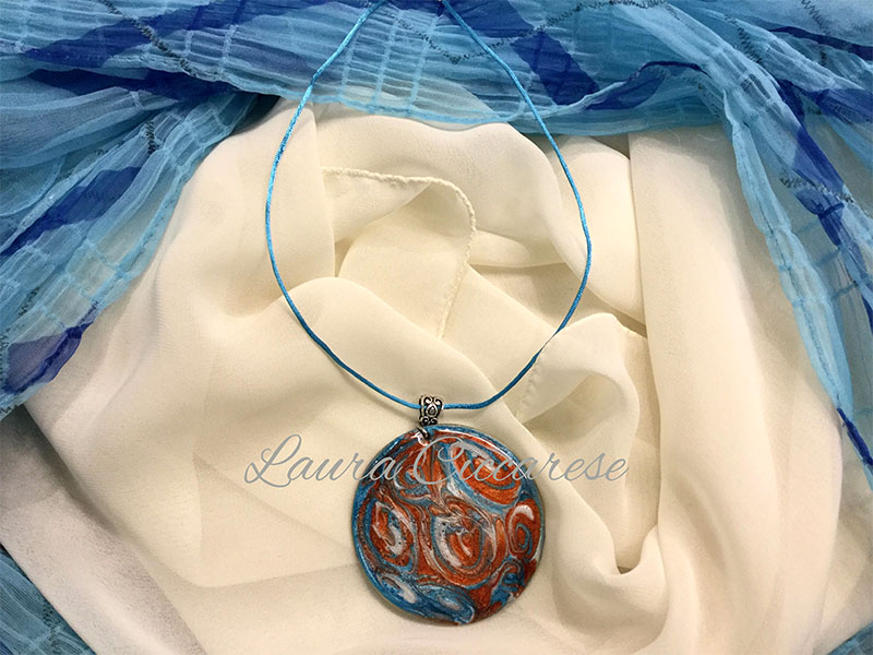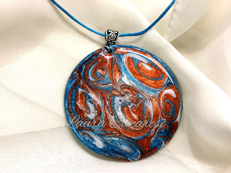 Collana con ciondolo in legno dipinto a mano con la tecnica della fluid art con colori perlescenti. Finitura in resina, lucidissima e resistente.